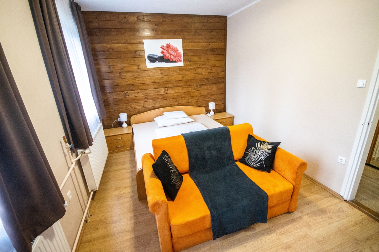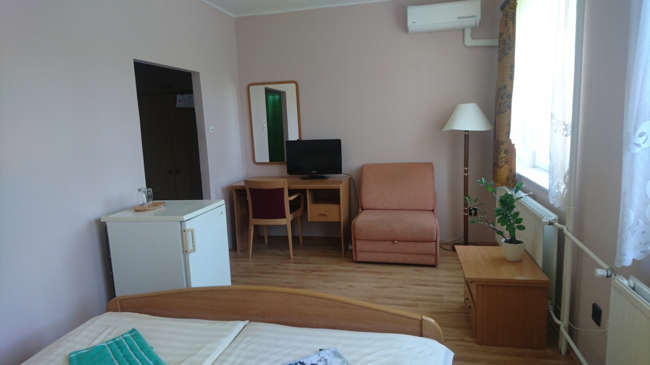 1-2 fős szobák(francia ágyas és külön álló ágyas) fürdőszobával, hűtőszekrénnyel, LCD televízióval, ingyenes WIFI -vel .